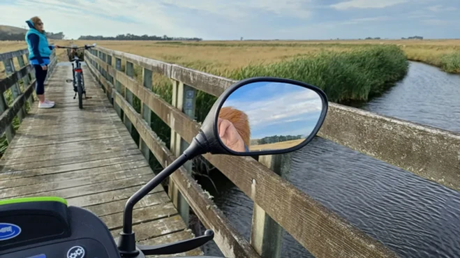 Caroline, Penny and I went for a short ride on the Rail Trail. Me on my scooter and she on her bike. We only went 4 kilometres in as the winds were a bit harsh. Still, we enjoyed the little we accomplished. Over the next few days some of the group enjoyed day trips to neighbouring towns including popular Little River, Akaroa and nearby Birdlings Flat. I have fond memories of there as a child fossicking for precious stones. Some of us also went ‘around the block.’ It is 4 kilometres on a mix of shingle and sealed roads. Ray took advantage of a moment for a teaching lesson (p11) on his new water bladder and a water pump which runs off his cordless drill. Interesting and tempting to purchase!