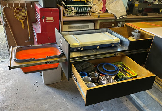 The first drawer was 1 long drawer for waterproof storage boxes which would hold food & other things, the second drawer had a chopping board pull out tray that converted to a kitchen sink/washing area, 3 burner gas cooker that sat on the top, plate & cutlery drawer & a back section for other miscellaneous items (eg cooking spray, gas bottle, cleaning supplies etc).